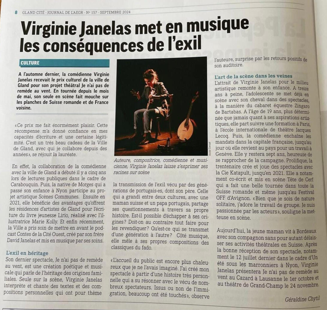 Seule en scène, Virginie Janelas interprète et chante des textes et des compositions personnelles autour de la transmission du vécu de l’exil. Celui notamment de générations de portugais·es, dont son père, depuis la Révolution des œillets en 1974.